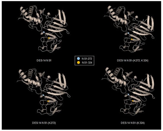 Structural features of DENV-2 NS1 protein. Tridimensional structure prediction of DES-14 NS1 protein (Genbank access number MG189962) and the three mutants DES-14 NS1-(K272, K324), NS1-(K272), and NS1-(K324) was performed by modeling on PHYRE2 protein recognition server (http://www.sbg.bio.ic.ac.uk/~phyre2/html/page.cgi?id=index; accessed on 23 December 2022). The predicted structures were analyzed with PyMOL 2.5, a program for interactive visualization of tridimensional proteins. The colored dots indicate the positions of residues NS1-272 and NS1-324 in the 3D structure of NS1 protein.