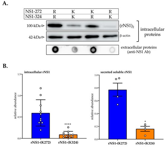 Effects of amino-acid substitutions R272K and R324K on DENV-2 rNS1 expression. Huh7 cells were transfected for 24 h with plasmids expressing DENV-2 rNS1wt or rNS1-(K272), rNS1-(K324), and rNS1-(K272, K324) mutants. In (A), immunoblot assay was performed on non-heated RIPA cell lysates (intracellular proteins) and cell supernatants (extracellular proteins) using anti-NS1 antibody D/2/D6/B7 (anti-NS1 Ab). The intracellular NS1 dimer is indicated as (rNS1)2. The β-actin protein served as a protein loading control. The estimated apparent molecular weights of (rNS1)2 and β-actin are indicated. The basic residues at the positions NS1-272 and NS1-324 are shown at the top. In (B), signal intensity was quantified using ImageJ software to evaluate the amount of rNS1 mutants relative to rNS1wt. The results are the mean (± SEM) of 10 (intracellular rNS1) or 4 (secreted rNS1) replicates (open circles). p-values were determined on the comparison of rNS1-(K324) with rNS1-(K272) mutant (**** p < 0.0001; * p < 0.05).