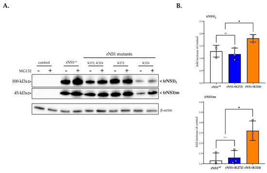 Effect of proteasome inhibition on DENV-2 rNS1 expression. Huh7 cells were transfected for 24 h with plasmids expressing DENV-2 rNS1wt or rNS1-(K272), rNS1-(K324), and rNS1-(K272, K324) mutants or mock-transfected (control) in presence (+) or absence of 10 µM of the proteasome inhibitor MG132 in 0.1% DMSO for 6 h. In (A), immunoblot assays were performed on RIPA cell lysates using anti-NS1 antibody. Cell lysates were analyzed before (top) and after (bottom) heat-denaturation in the presence of a reducing agent. The mouse anti-NS1 antibody D/2/D6/B7 (anti-NS1 mAb) was used to detect heat-labile dimer rNS1 which is indicated as (NS1)2. The rabbit anti-NS1 antibody PA5-33207 (anti-NS1 pAb) was used to detect monomeric form of rNS1 which is indicated as (rNS1)m. The β-actin protein served as a protein loading control. The estimated apparent molecular weights of (rNS1)2 and (rNS1)m are indicated. In (B), signal intensity was quantified using ImageJ software to calculate the fold-increase between the amounts of rNS1 expressed with or without MG132 (control). The results are the mean (± SEM) of 3 replicates (open circles). p-values were determined on the comparison of different rNS1 (* p < 0.05; n.s.: not significant).