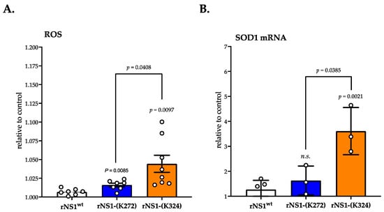 ROS production in Huh7 cells expressing the rNS1-(K24) mutant. Huh7 cells were transfected for 24 h with plasmids expressing DENV-2 rNS1wt, rNS1-(K272), or rNS1-(K324). In (A), the production of total intracellular reactive oxygen species (ROS) was measured using DCFH-DA dye. Intracellular ROS in samples was expressed as a fold change relative to mock-transfected cells. In (B), antioxidant enzyme superoxide dismutase (SOD-1) mRNA levels were quantified by RT-qPCR. Results are expressed as the fold induction of transcripts in samples relative to those in mock-transfected cells. The results are the mean (± SEM) at least seven (A) and three (B) replicates (open circles). p-values were determined on the comparison of rNS1 mutants versus rNS1wt and rNS1-(K324) mutant versus rNS1-(K272) mutant (n.s.: not significant).