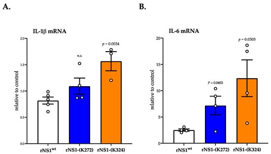 Pro-inflammatory cytokine activation in Huh7 cells expressing the rNS1-(K324) mutant. Huh7 cells were transfected for 24 h with plasmids expressing rNS1wt or the rNS1-(K272) and rNS1-(K324) mutants. The IL-1β (A) and IL-6 (B) transcripts were quantified by RT-qPCR. Results are expressed as the fold induction of transcripts in samples relative to those in mock-transfected cells. The results are the mean (± SEM) at least three replicates (open circles). p-values were determined on the comparison of rNS1 mutants versus rNS1wt.