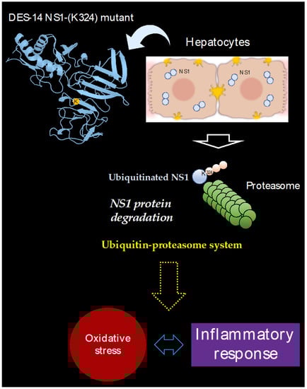We wondered whether the instability of the DES-14 NS1-(K324) mutant is the consequence of a proteasome-mediated protein degradation of protein in Huh7 cells [27]. Indeed, the C-terminal lysine residues of NS1 could be targeted by UPS [18]. The ability of proteasome inhibitor MG132 to increase the protein level of DES-14 NS1-(K324) mutant in Huh7 cells suggests that Lys324 could engage DENV-2 NS1 protein in a proteasome-mediated degradation. It is well documented that activation of the ubiquitin-proteasome system may cause ER-stress associated to an increase in ROS production [28]. Consistent with this finding, expression of the DES-14 NS1-(K324) mutant resulted in increased production of ROS associated to the transcriptional activation of the antioxidant SOD1 enzyme. Given that increase in ROS production can trigger activation of a pro-inflammatory response as a host-cell defense mechanism [29,30], the up-regulation of mRNA cytokines IL-1β and IL-6 was observed in Huh 7 cells overexpressing the DES-14 NS1-(K324) protein mutant. Thus, the presence of a lysine at position DENV-2 NS1-324 would have a propensity to promote the proteasome-mediated degradation of protein, triggering oxidative stress and pro-inflammatory cytokine activation in human hepatoma cells (Figure 6).