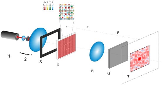 The scheme of speckle polarization mapping of a nucleotide sequence. 1—continuous-wave laser source; 2—telescopic system with a pinhole as a beam cleaner and expander; 3—aperture diaphragm; 4—gene-based spatial light modulator; 5—Fourier-transforming lens; 6—polarimetric unit; 7—output plane. A four-color presentation is used to display the principle of the content-to-phase transformation; the color saturation corresponds to the content of the given nucleotide in a coded triplet. White light indicates the absence of the given nucleotide.