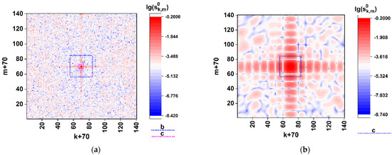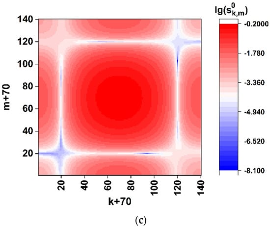 Note that at the given value of characterizes magnification of the formed diffraction pattern in plane 7 (Figure 1). In the case of the instrumental implementation of the polarimetric system shown in Figure 1, this parameter is related to the wavelength of readout radiation generated by the laser (item 1), focal length of the Fourier-transforming lens (item 5), and values of the pixel sizes of the gene-based spatial light modulator (item 4) and detector in plane 7. The characteristic speckle size (in the case of random distributions of and ) or the size of diffraction peaks (in the case of uniform distributions of and ) in plane 7 is determined by the ratio . On the other hand, a characteristic size of the formed diffraction pattern in the plane 7 relates to the ratio . An increase in or leads to an increase in transverse dimensions of the diffraction pattern in plane 7 and, thereby, to an increase in its acquired details at fixed values of the number and size of detector pixels. In the case of computer simulation, a decrease in leads to an increase in the details of the synthesized diffraction pattern and corresponding distributions of the local values of the Stokes vector in the paraxial region (similarly to a decrease in or in the case of instrumental implementation).