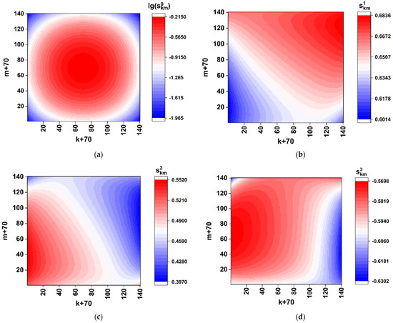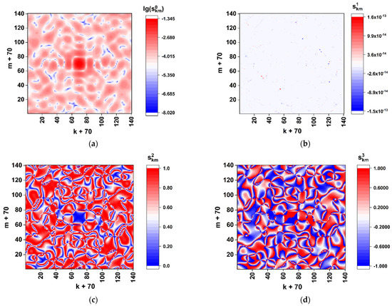 As an example, consider distributions of the values in the plane in case of the SARS-CoV-2 Wuhan strain [34]. Figure 3 displays the color maps of distributions recovered using the Formulas (4)–(6) in case of and . The scale factor was set equal to 0.1 in order to refine the features of distributions in the paraxial zone. Note that the used phase modulation algorithm leads to a two-grade (binary) polarization structure of the boundary field (directly behind the synthesized phase screen). This follows from the identity of the x-component states of the boundary field in the regions behind the elements equal to 0 and 2 (the principal value of the phase delay of the readout beam equal to 0) and equal to 1 and 3 (the principal value of the phase delay equal to π). With the uniform phase delay of the y-component to the x-component (see Formula (2)), the model boundary field distribution will be fragmented to a set of equal-sized fragments with the right circular or left circular polarization.