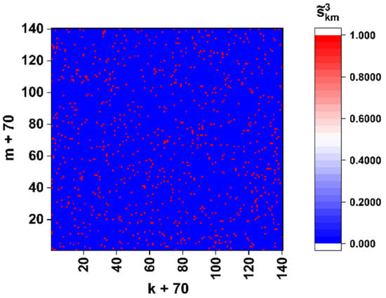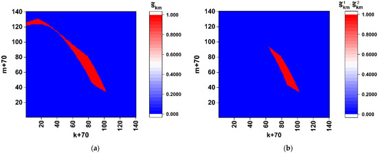 As an example, Figure 7a displays the corresponding binary map for the GB retardation-modulating matrix corresponding to the Wuhan variant. Panel 7b represents the result of superposition of the binary maps for the Wuhan and Omicron variants. In accordance with the modeled datasets presented in Figure 6, the threshold and maximum deviations were set equal to: 0.655, 0.475, 0.005, and 0.005. The correlation coefficient (the upper index “1” corresponds to the Wuhan variant and “2” corresponds to the Omicron variant) is equal to ≈0.536. Note that the discrimination condition (20) also defines a set of coordinates ; for those, the component varies within a certain range (it follows from the normalization condition ).