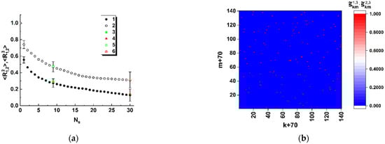 The results of modeling are presented in Figure 5, a as the values of and against the number of nucleotide substitutions. As an example of decorrelation of the binary maps due to changes in the sequence structure, Figure 5b displays an effect of superposition of the binary maps corresponding to the Wuhan and Omicron variants (compare the densities of the unit states in Figure 4 and Figure 5b). We can see that the substitution of only a few nucleotides in the analyzed sequence with respect to the reference leads to a sharp decrease in the number of coinciding points on the binary maps corresponding to the analyzed and reference sequences.
