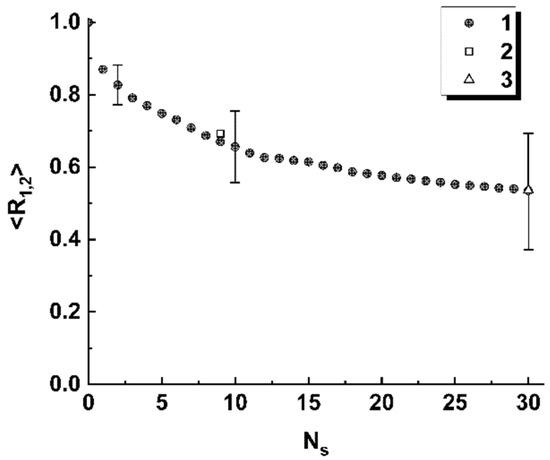 Sensitivity of the introduced correlation coefficient (Equation (8)) to the local changes in the structure of the initial nucleotide reference sequence was analyzed by gradual replacement of individual nucleotides in the triplets (for example, , , etc.). Due to quasi-stochastic distributions of the elements of the generated matrices , it is necessary to average the coefficient over a sample set of the binary distributions . This sample set was generated as a result of random changes of a given number of the nucleotides in the original sequence. The nucleotide sequence of the spike gene derived from the SARS-CoV-2 Wuhan variant was considered as the initial sequence with the corresponding binary distribution . The sample size used for averaging was equal to 10. The number of replaced nucleotides varied from 0 to 30. In the modeling, the extreme states of the third () and fourth () components of the Stokes vector were considered; accordingly, discrimination thresholds were chosen as 0.99 and −0.99.