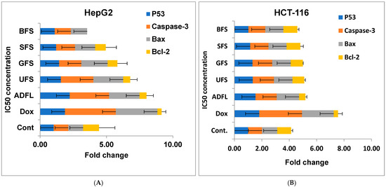 On the other hand, human colon cancer cell lines (HCT-116) exposed to IC50 doses of ADFL, UFS, GFS, SFS, and BFS compared to both the control cell line and the other samples that were treated with doxorubicin were also used to study the apoptosis-inducing property of the tested samples (Figure 2B). Data showed that ADFL was the most effective sample in up-regulating p53, Cas-3, and Bax (at 1.54, 1.54, and 1.63 fold change, respectively) and down-regulating the Bcl-2 gene (at a 0.46 fold change) compared to untreated cells. The standard drug (doxorubicin) demonstrated an up-regulation of the studied pro-apoptotic genes as follows: 1.81 for p53, 3.12 for Cas-3, and a 2.31 fold change for Bax genes, and a down-regulation of the Bcl-2 gene (at a 0.31 fold change). Whereas, the UFS, GFS, SFS, and BFS samples induced the up-regulation of p53 (at 1.34, 1.32, 1.15, and 1.02 fold change, respectively), Cas-3 (at 1.54, 1.43, 1.33, and 1.23 fold change, respectively), and Bax (at 1.36, 1.36, 1.32, and 1.32 fold change, respectively) genes and the down-regulation of the Bcl-2 gene (at 0.85, 0.88, 1.00, and 1.01 fold change) relative to the standard drug doxorubicin.