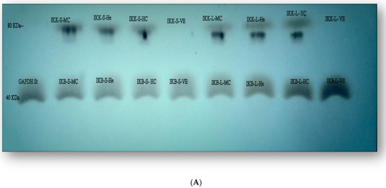 To further confirm the results of the IKK-α and IKK-β expressions, the signaling pathway was further investigated through a Western blotting assay (Figure 4A,B and Table 6 and Table 7).