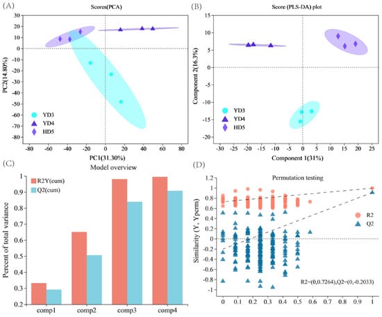 Multivariate statistical score and permutation testing among the four rice varieties. (A) PCA. (B) PLS-DA. (C) Overview of the PLS-DA model. (D) PLS-DA permutation testing.
