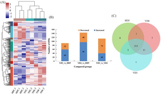 The heatmap of cluster analysis can be used to understand the accumulation of different metabolites among different varieties as a whole. The metabolite of the YD3_3 sample deviated greatly, so the analysis was conducted after removing the YD3_3 sample. There were significant differences in the accumulation of metabolites among different varieties, and the biological repetitions of each group were highly similar (Figure 2A). Ninety-one DMs (59 increased and 32 decreased) were identified in the YD3 and HD5 comparison groups (Figure 2B; Table S2). Glycerophospholipids accounted for 14.06%, prenol lipids accounted for 7.81%, glycerolipids accounted for 6.25%, phenols accounted for 1.56%, and flavonoids accounted for 1.56% (Figure S1A). A total of 144 DMs (96 increased and 48 decreased) were identified in the YD4 and HD5 comparison groups (Figure 2B; Table S3). Prenol lipids accounted for 6.98%, glycerophospholipids accounted for 5.81%, flavonoids accounted for 2.33%, and phenols accounted for 1.16% (Figure S1B). A total of 144 differential metabolites (96 increased and 48 decreased) were identified in the YD3 and YD4 comparison groups (Figure 2B; Table S4). Glycerophospholipids accounted for 11.69%, prenol lipids accounted for 7.79%, and flavonoids accounted for 1.3% (Figure S1C). Sample correlation analysis indicated that the sample correlation coefficient was high, suggesting that the sample repeatability was good (Figure S2A). Each variety also had unique metabolites (Figure S2B–D).