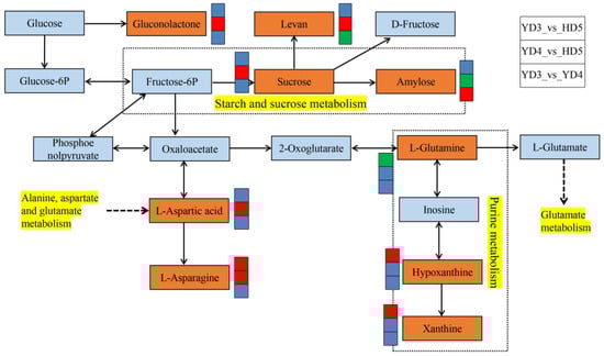 The DMs of the YD3 and HD5 comparative groups participated in alanine, aspartate, and glutamate metabolism, alpha-linolenic acid metabolism, and tryptophan metabolism (Table 2). The DMs of the YD4 and HD5 comparative groups participated in pantothenate and CoA biosynthesis; alanine, aspartate, and glutamate metabolism; starch and sucrose metabolism; tryptophan metabolism; and glycerophospholipid metabolism (Table 2). The DMs of the YD4 and HD5 comparative groups participated in pantothenate and CoA biosynthesis, alpha-linolenic acid metabolism, starch and sucrose metabolism, and beta-alanine metabolism (Table 2).