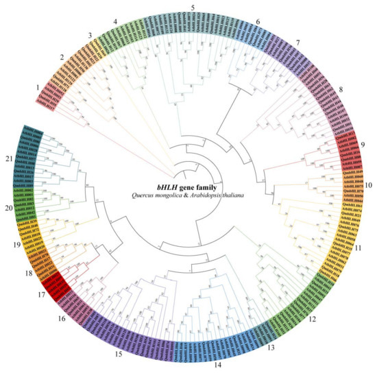 Phylogenetic relationships among the bHLH proteins in Q. mongolica and A. thaliana. The phylogenetic tree was built in MEGA 7.0 via the N-J approach with 1000 bootstrap replicates. All QmbHLH genes were grouped into 21 subgroups according to the topological structure of the tree and classification rules of the Arabidopsis bHLH genes.