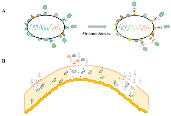 Temperate phages have been widely demonstrated to promote bacterial virulence, which is the most important factor in causing infections [117]. However, there is no lack of evidence indicating that phages can reduce bacterial virulence, intrinsically or after proper modification. For example, reducing virulence to gain phage resistance, or reducing virulence to increase host fitness (Figure 2A).