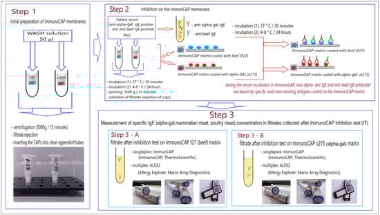 Two types of filtrate were obtained for each sample: (A) the filtrate after the inhibition test on the ImmunoCAP f27 (beef; f27-ImmunoCAP inhibition test; f27-IT) and (B) the filtrate after the inhibition test on the ImmunoCAP o215 (α-Gal; o215-ImmunoCAP inhibition test; o215-IT).
