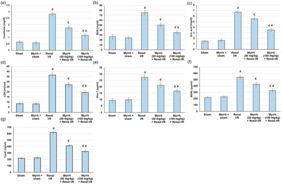 The assessment of myrrh essential oil (50 and 100 mg/kg) administration for three weeks prior to renal ischemia/perfusion (I/R) through the renal function tests: (a) creatinine, (b) BUN, (c) uric acid, (d) LDL; renal injury biomarkers: (e) Kim-1, (f) NGAL, and (g) CysC. All values are expressed as mean ± SD. # indicates a statistically significant difference from the sham group, € indicates a statistically significant difference from the renal I/R group, and ¥ indicates a statistically significant difference from myrrh 50 mg/kg + renal I/R group (p < 0.05) using one-way ANOVA followed by Turkey’s post hoc test (n = 6).