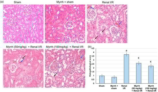 The assessment of myrrh essential oil (50 and 100 mg/kg) administration for three weeks prior to renal ischemia/perfusion (I/R) in histopathological analysis: (a) renal sections stained with hematoxylin and eosin (H&E) and (b) quantitative assessment of renal damage score. Blue arrows show renal proteinaceous casts and edema, and black arrows show masses of necrotic cellular debris. # indicates a statistically significant difference from the sham group, € indicates a statistically significant difference from the renal I/R group.