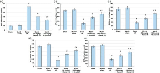 An assessment of myrrh essential oil (50 and 100 mg/kg) administration for three weeks prior to renal ischemia/perfusion (I/R). Renal oxidative stress markers: (a) MDA, (b) GSH, (c) GPx, (d) SOD, and (e) CAT. All values are expressed as mean ± SD. # indicates a statistically significant difference from the sham group, € indicates a statistically significant difference from the renal I/R group, and ¥ indicates a statistically significant difference from myrrh 50 mg/kg + renal I/R group (p < 0.05) using one-way ANOVA followed by Turkey’s post hoc test (n = 6).