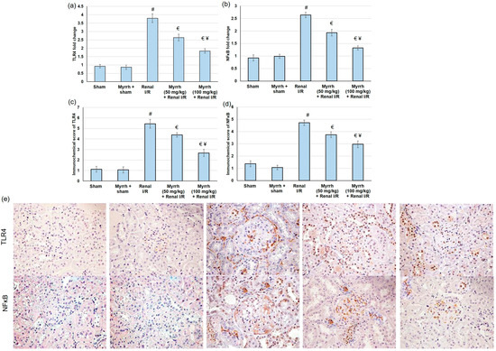 Renal injury triggered by I/R produces numerous damage-associated molecular patterns (DAMPs) proteins, which signal through TLRs, mainly TLR4, to activate multiple inflammatory mediators [37]. NFκB is an essential downstream effector of TLR4 signaling. Therefore, in the current study, we evaluated both TLR4 and NFκB by real-time PCR and immunohistochemistry. Compared to the sham group, TLR4 and NFκB gene expression was significantly augmented in the renal I/R group. TLR4 and NFκB gene expression declined considerably in rats pretreated with myrrh essential oil compared to renal I/R animals, as shown in Figure 4.