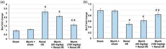The assessment of myrrh essential oil (50 and 100 mg/kg) administration for three weeks prior to renal ischemia/perfusion (I/R) regarding the apoptosis mediators (a) Bax and (b) Bcl2 gene expression. All values are expressed as mean ± SD. # indicates a statistically significant difference from the sham group, € indicates statistically substantial from the renal I/R group, and ¥ indicates a statistically significant difference from myrrh 50 mg/kg + renal I/R group (p < 0.05) using one-way ANOVA followed by Turkey’s post hoc test (n = 6).