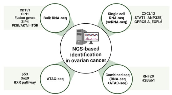 Recent studies have shown that next-generation sequencing (NGS)-based approaches provide a rationale for sequence-matching therapies to improve the overall drug response and survival rates in cancer patients []. The genetic landscape of cancer patients, including mutational status and gene expression patterns, may provide new druggable targets and pathways, leading to a clinical advantage for cancer patients [,,]. Thus, a variety of NGS-based applications, such as whole transcriptome sequencing (RNA-seq) and assays for transposase-accessible chromatin sequencing (scATAC-seq), have been used to investigate the detailed genetic landscape of OC. These efforts not only provide detailed information for the understanding of the genetic variation of OC but also form the basis for immunotherapy, a new therapeutic strategy for the treatment of OC.