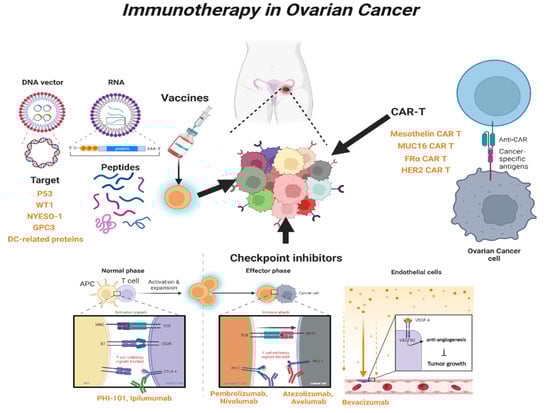 - Palaia, I.; Tomao, F.; Sassu, C.M.; Musacchio, L.; Benedetti Panici, P. Immunotherapy For Ovarian Cancer: Recent Advances And Combination Therapeutic Approaches. Onco. Targets Ther. 2020, 13, 6109–6129. [Google Scholar] [CrossRef] [PubMed]