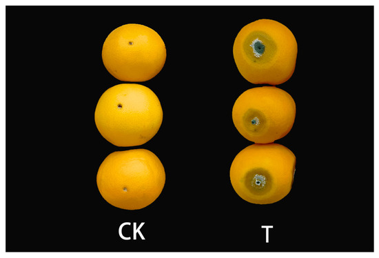 Surface disinfection of 62–67 mm mature, medium-sized fruits harvested from the same asexual line in Xinping County by treating them with 4% sodium hypochlorite solution. Then, four holes (4 mm length × 4 mm width × 3 mm depth) were punched on the equator of each fruit skin with a punching bear after autoclaving, 30 μL of spore suspension was injected into each well separately as the treatment group, while the treatment injected with an equal amount of autoclaved distilled water was used as the control, and five Bing tang oranges were treated in each treatment and control group [35]. The treated fruits were packed into sterile plastic boxes and incubated in an ultra-clean bench at 25 °C for seven days, respectively. A sample of the peel with a radius of about 3 cm was taken from each hole, quickly stored in liquid nitrogen, and sent to Bioyi Biotechnology Co., Ltd. Wuhan, China, for transcriptome sequencing. Three biological replicates were set up for both the treatment and control groups (see Figure 1).