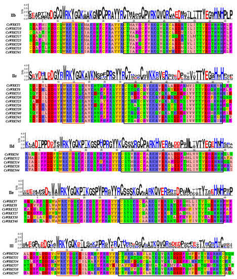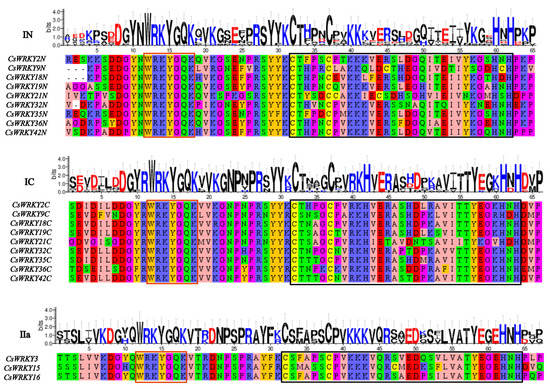 Results of multiple sequence alignment of domains of CsWRKY TFs. Heptad domains were displayed in the red box, while C2H2 or C2HC-type zinc finger structures were displayed in the black box. Roman numerals I, II, and III represented different groups. IN represented the N-terminal WRKY domain of group I, and IC represented the C-terminal WRKY domain of group I. IIa,b,c,d,e were different subgroups. The sequence logos were performed using the online mapping tool WebLogo. The Y-axis (in bits) indicates the overall height of the stack. The type of amino acids occurring at each position reflected the preference of the sequence at that position. The size of each letter was positively correlated with the frequency of amino acids at that position.