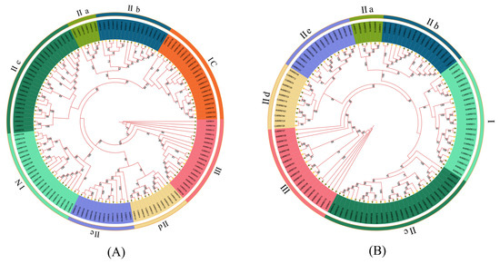 Generally speaking, two or more genes with similar sequences had high similarity in function and regulation and vice versa. We detected the taxonomic situation and evolutionary relationships of each CsWRKY TFs by performing multiple sequence comparisons and constructing phylogenetic trees for the structural domains of CsWRKY and AtWRKY TFs (Figure 2 and Figure 3). Members of subfamily I contained two heptad domains and two C2H2-type zinc finger domains, members of subfamily II included a WRKY domain and a C2H2-type zinc finger domain, and members of subfamily III contained a heptapeptide-conserved sequence and a C2HC-type zinc finger domain. Among them, CsWRKY20 from group IIc showed the heptad domain of WRKYGKK, and similar ones, such as WRKYGRK and WSKYEQK, were also found in Populus trichocarpa [40], which showed that the heptad domains and zinc finger domains of CsWRKY TFs had an overall low degree of variation. The subfamilies I, II and III were further subdivided into eight subgroups by combining sequence similarities. Subfamily I contained nine CsWRKYs; subfamily II included 32 members (IIa3, IIb8, IIc10, IId5, IIe6), the largest; subfamily III had six members. At the evolutionary level, the CsWRKY and AtWRKY were evenly distributed on each branch, which indicated that they had similar evolutionary patterns. The N-terminal and C-terminal WRKY domains in subfamily I were clustered into different evolutionary parts, and the five subgroups in subfamily II were not all clustered into one. While IIa, IIb, IId, and IIe belonged to the same subgroup, respectively, which were close to each other and belonged to parallel evolutionary processes but indicated the evolutionary differences between discrepant subgroups. After comparing the two plots in Figure 3A,B, we confirmed that the evolutionary tree construction based on both domains and full-length protein sequences could accurately indicate taxonomic and phylogenetic relationships of CsWRKY TFs, achieving mutual validation support.