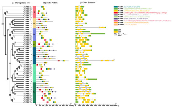 Phylogenetic relationship, motif composition, and coding gene structure of WRKY TFs. (a) The phylogenetic tree was constructed based on the full-length amino acid sequences of CsWRKY TFs by IQ-TREE. (b) The forty-seven motifs of CsWRKY TFs were predicted by the MEME. Different colored boxes and numbers indicated various motifs, and numbers 1–10 were shown correspondingly in the various colored boxes. Short sequences of various motifs have been annotated behind them. (c) Intron-exon structures for forty-seven genes were derived from the TBtools software. Exons, introns, and non-coding regions (UTRs) were indicated by green boxes, gray lines, and yellow boxes, respectively. The numbers 0, 1, and 2 represent the phase information of the intersection point between introns and exons.
