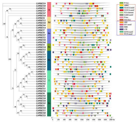 To predict the cis-acting elements in the promoter, we extracted the upstream 2000 bp base sequences of the CsWRKY genes by TBtools. The promoter analysis was performed using the online PlantCARE (http://plantpan.itps.ncku.edu.tw/index.html, accessed on 25 July 2022), and the results were finally collated and visualized [31].