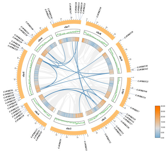 Chromosome distribution, gene density, gene duplication, and collinearity analysis for CsWRKY genes. The gray line indicated all duplicated genes in the sweet orange genome, blue presents duplicated WRKY gene pairs, the gene density was shown as a heat map, and line graph with increasing density from blue to gray to yellow, and chromosome names were shown on the outside of each chromosome.