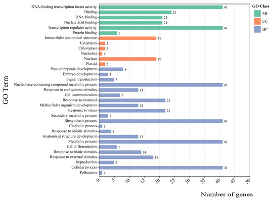 Genome sequencing data have shown that most genes with core biological functions are common to all eukaryotes. GO annotation classification system is subject to elaborate biological macromolecules with three major underlying classifications: cellular components, molecular function, and biological processes [43]. To further understand the expression of forty-seven CsWRKY genes, we performed GO annotation to analyze (Supplementary Table S4). Forty-one of forty-seven CsWRKY genes were up to 387 GO terms, mainly including three categories, of which 87.86% were to biological processes. Since nearly 400 GO terms were done, we selected 41 GO-Level 3 for display (Figure 7). The molecular functional categories mainly included heterocyclic compound binding (GO:1901363) and DNA-binding transcription factor activity (GO:0003700). Intracellular anatomical structure (GO:0005622) and membrane-enclosed lumen (GO:0031974) were in the cellular components. The category of biological processes was mainly involved in the organic substance metabolic process (GO:0071704), regulation of the process (GO:0050789), nitrogen compound metabolic process (GO:0006807), cellular metabolic process (GO:0044237), and biosynthetic process (GO:0009058).