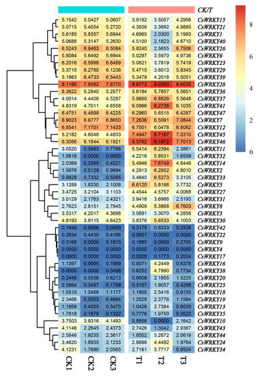 Heat map of forty-seven CsWRKY gene expression profiles under P. digitatum stress. Different colored boxes represented different log2(FPKM) values, and the expression gradually increased from blue to white to red. CK represented the control group, and T represented the treatment group.