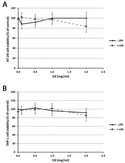 Effects of Ozoile (OZ) on HT-29 (A) and THP-1 (B) cell viability in the presence or absence of LPS (1 µg/mL). Different concentrations of Ozoile (0.1, 0.5, 1 and 2 mg/mL) were added to the culture medium 30 min before LPS treatment (1 µg/mL for 4 h), and then cell viability was assessed by the MTT test. Results are expressed as percentages relative to untreated cells. Data are means ± SEM from five independent experiments.
