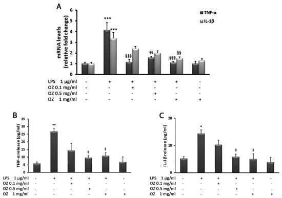 Effects of Ozoile (OZ) on cytokine gene expression (A) and release (B,C) in HT-29 cells stimulated with LPS. (A) HT-29 cells were treated with different concentrations of Ozoile (0.1, 0.5 and 1 mg/mL) 30 min before LPS treatment (1 µg/mL for 4 h). The mRNA transcript levels of TNF-α and IL-1β were analyzed by real-time PCR. (B,C) Cytokine release into culture medium was measured by ELISA. Data are expressed as means ± SEM from three independent experiments. * p < 0.05, ** p < 0.01 and *** p < 0.001 indicate significant differences vs. control cells. § p < 0.05, §§ p < 0.01 and §§§ p < 0.001 indicate significant differences vs. LPS-treated cells.