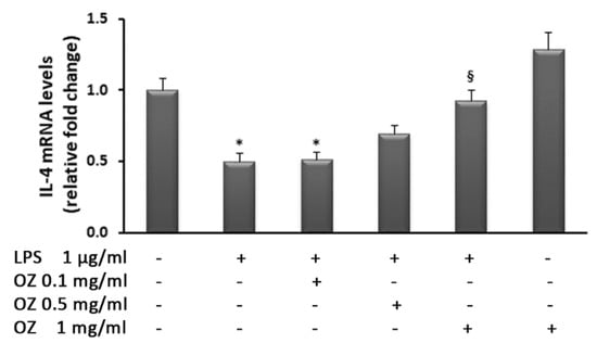 Effects of Ozoile (OZ) on IL-4 gene expression in HT-29 cells stimulated with LPS. HT-29 cells were treated with different concentrations of Ozoile (0.1, 0.5 and 1 mg/mL) 30 min before LPS exposure (1 µg/mL for 4 h). The mRNA transcript levels were analyzed by real-time PCR. Data are expressed as means ± SEM from three independent experiments. * p < 0.05 indicates a significant difference vs. control cells. § p < 0.05 indicates a significant difference vs. LPS-treated cells.