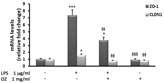 Effects of Ozoile (OZ) on ZO-1 and CLDN1 gene expression in HT-29 cells stimulated with LPS. HT-29 cells were treated with 1 mg/mL of Ozoile 30 min before LPS treatment (1 µg/mL for 4 h). The mRNA transcript levels were analyzed by real-time PCR. Data are expressed as means ± SEM from three independent experiments. * p < 0.05 and *** p < 0.001 indicate significant differences vs. control cells. §§ p < 0.01 and §§§ p <0.001 indicate significant differences vs. LPS-treated cells.