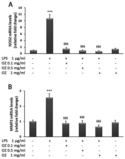 Effects of Ozoile (OZ) on NOS2 (A) and MMP2 (B) gene expression in HT-29 cells stimulated with LPS. HT-29 cells were treated with different concentrations of Ozoile (0.1, 0.5 and 1 mg/mL) 30 min before LPS treatment (1 µg/mL for 4 h). The mRNA transcript levels of NOS2 and MMP2 were analyzed by real-time PCR. Data are expressed as means ± SEM from three independent experiments. *** p < 0.001 indicates a significant difference vs. control cells. §§§ p < 0.001 indicates a significant difference vs. LPS-treated cells.