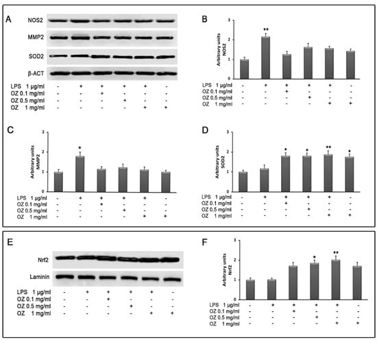 Evaluation of NOS2, MMP2, SOD2 (A) and Nrf2 (E) protein expression by Western blotting in HT-29 cells treated with different concentrations of Ozoile (0.1, 0.5 and 1 mg/mL), added 30 min before LPS treatment (1 µg/mL for 4 h). Densitometric analysis of NOS2 (B), MMP2 (C) and SOD2 (D) after normalization against β-actin and of Nrf2 (F) after normalization against laminin. The results are expressed as means ± SEM from three independent experiments. * p < 0.05 and ** p < 0.01 indicate significant differences vs. control cells.
