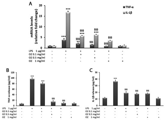 Effects of Ozoile (OZ) on TNF-α and IL-1β gene expression (A) and release (B,C) in THP-1 cells stimulated with LPS. (A) THP-1 cells were treated with different concentrations of Ozoile (0.1, 0.5 and 1 mg/mL) before LPS treatment (1 µg/mL for 4 h). The mRNA transcript levels were analyzed by real-time PCR. (B,C) Cytokine release into the culture medium was measured by ELISA. Data are expressed as means ± SEM from three independent experiments. ** p < 0.01 and *** p < 0.001 indicate significant differences vs. control cells. §§§ p < 0.001 indicates a significant difference vs. LPS-treated cells.