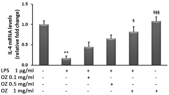 Effects of Ozoile (OZ) on IL-4 gene expression in THP-1 cells stimulated with LPS. THP-1 cells were treated with different concentrations of Ozoile (0.1, 0.5 and 1 mg/mL) 30 min before LPS exposure (1 µg/mL for 4 h). The mRNA transcript levels were analyzed by real-time PCR. Data are expressed as means ± SEM from three independent experiments. ** p < 0.01 indicates a significant difference vs. control cells. § p < 0.05 and §§§ p < 0.001 indicate significant differences vs. LPS-treated cells.