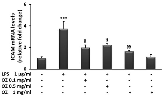 Effects of Ozoile (OZ) on ICAM gene expression in THP-1 cells stimulated with LPS. THP-1 cells were treated with different concentrations of Ozoile (0.1, 0.5 and 1 mg/mL) before LPS treatment (1 µg/mL for 4 h). The mRNA transcript levels were analyzed by real-time PCR. Data are expressed as means ± SEM from three independent experiments. *** p < 0.001 indicates a significant difference vs. control cells. § p < 0.05 and §§ p < 0.01 indicate significant differences vs. LPS-treated cells.