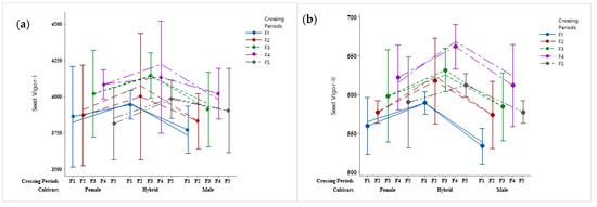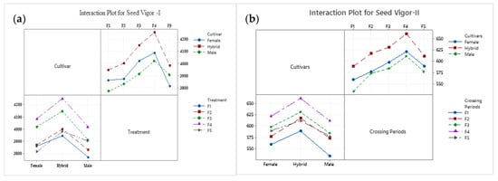 As an interaction plot, the seed vigor potential of bottle gourd hybrid HBGH-35 and two parental lines, female Pusa Naveen and male G2-line, were plotted. (a) Seed vigor I and (b) seed vigor II.