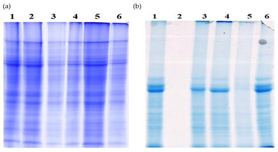 For in-gel digestion, 30 μg of protein was loaded into each well, excised using a scalpel as indicated, and then added to Eppendorf tubes (1.5 mL). Excised pieces were subjected to de-staining using 50 mM of DTT, diluted in 50 mM of ABC, and incubated at 56 °C for 2 h. After the reduction step, the DTT solution was removed and 100 mM of IAA in 50 mM of ABC was added for the alkylation of cysteine residues. Then, the IAA solution was removed from the gel pieces and washed three times with 50 mM of ABC. The gel pieces were then air-dried three times for 5 min at room temperature. Following this, 50 mM of ABC buffer, containing 12.5 ng/μL of sequencing-grade modified trypsin (freshly prepared), was added. Then, 40 mM of ABC was added to cover the gel pieces and incubated overnight at 37 °C.