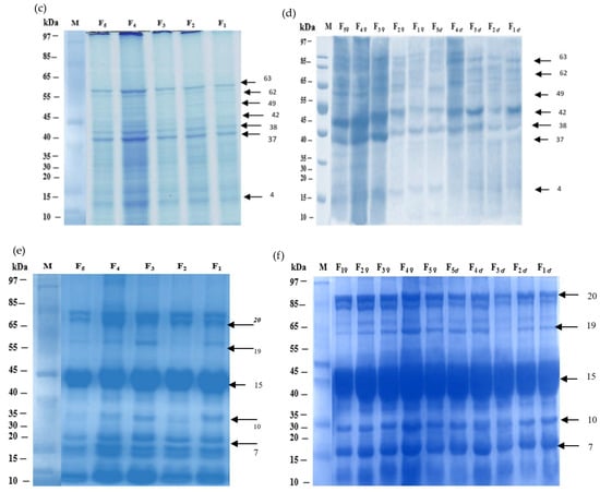 In this study, one bottle gourd hybrid HBGH-35 and two parenteral lines, G2 line (M) and Pusa Naveen (F), which differ in their quality and yield traits, were evaluated based on physiological characteristics (Figure 3c–f). SDS-PAGE separated the extractable bottle gourd proteins (leaves and seeds) into multiple components. The electrophoretic protein analysis exhibited a total of 102 protein bands in both parental lines and the hybrid. SDS-PAGE gels resolved 30 µg of protein sample from three biological replicates of the hybrid and two parenteral lines, and electrophoresed proteins were visualized after CBB staining. The banding pattern was consistent across all bottle gourd leaf proteins, resulting in 29 protein bands at various crossing times (see Figure 3c,d for positions of these polypeptides). Some bands were unique and specific markers for genotypes, which permitted their gel electropherograms’ identification and characterization. Six prominent peptide bands were identified with average molecular weights in the range of 39.1–52.4 kDa and 55.0–62.1 kDa (Figure 3c,d). These bands represent the major seed storage proteins and photosynthetic apparatus, accounting for 40–60% of the extracted bottle gourd protein. The 40 kDa polypeptide in hybrid HBGH-35 (Figure 3c) represents the photosynthetic apparatus with higher band strength and band intensity at F4 in comparison to the female line (Figure 3d, lanes 6–10) and the male line (Figure 3d, lanes 1–5). The relative protein expression was more prominent at F4 in all the cultivars, indicating the maximum accumulation of photosynthetic assimilates and storage reserves than at F1, F2, F3, and F5. The significant differences detected in band numbers 4, 37, 38, 42, 49, 62, and 63 differed in appearance and band intensity depending on the storage proteins (Figure 3c,d). Thus, the results indicated that the higher band strengths and apparent band intensities were higher in hybrid HBGH-35, followed by the Pusa Naveen (F) (Figure 3c,d, lanes 6–10) line at the F4 crossing period.