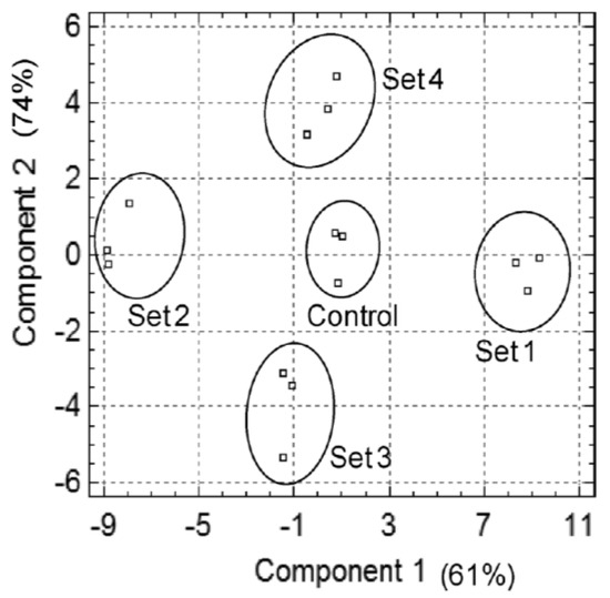 PCA score plot to assess the variance among the protein compositions of the four sets and the control protein mixtures (n = 3). Component−1 explains 62.6% of the variability of the data, whereas component 2 is responsible for 13.9% (the total accumulated percentage is 75%).