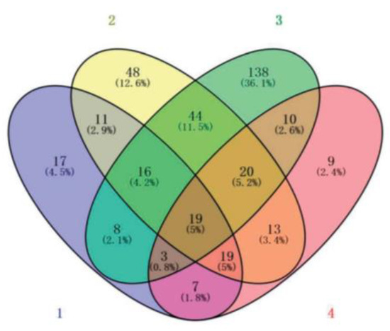 Figure 5 compares the changes in differential protein expression under the different crossing periods. The expression of 77 and 13 proteins was significantly reduced and elevated, respectively, following the F1 crossing period (control). The abundance of 141 and 13 proteins was significantly lessened and increased, respectively, following the F4 crossing period, and the abundance of 19 and 13 proteins was significantly lessened and elevated, respectively, following the F3 crossing period.