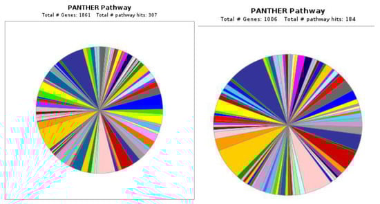 Using Gene Ontology (GO) online PANTHER (Protein Analysis Through Evolutionary Relationships) 8.0 software, a total of 1861 pathway hits in HBGH-35 and 1006 pathway hits in Pusa Naveen were observed (Figure 6). PANTHER is an approach to outlining the genes and gene product properties that are shared across species. The PANTHER classification system (http://pantherdb.org/ 15 October 2022) has been designed to classify proteins (and their corresponding genes) to facilitate high-throughput analysis.